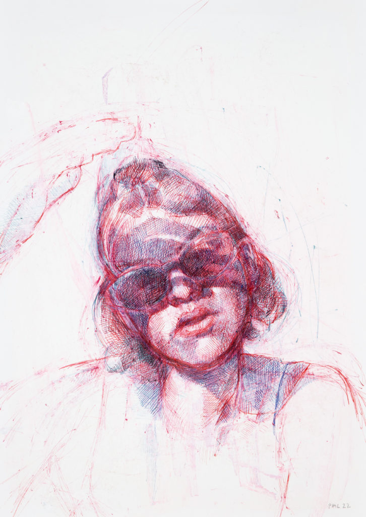 « Delphine aux lunettes », stylo et gouache sur papier, 42 x 29,7cm, 2022